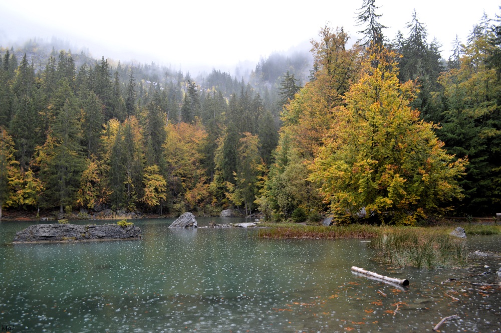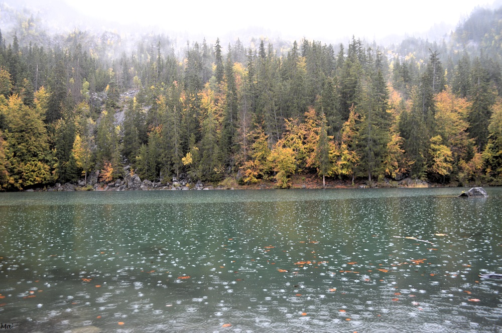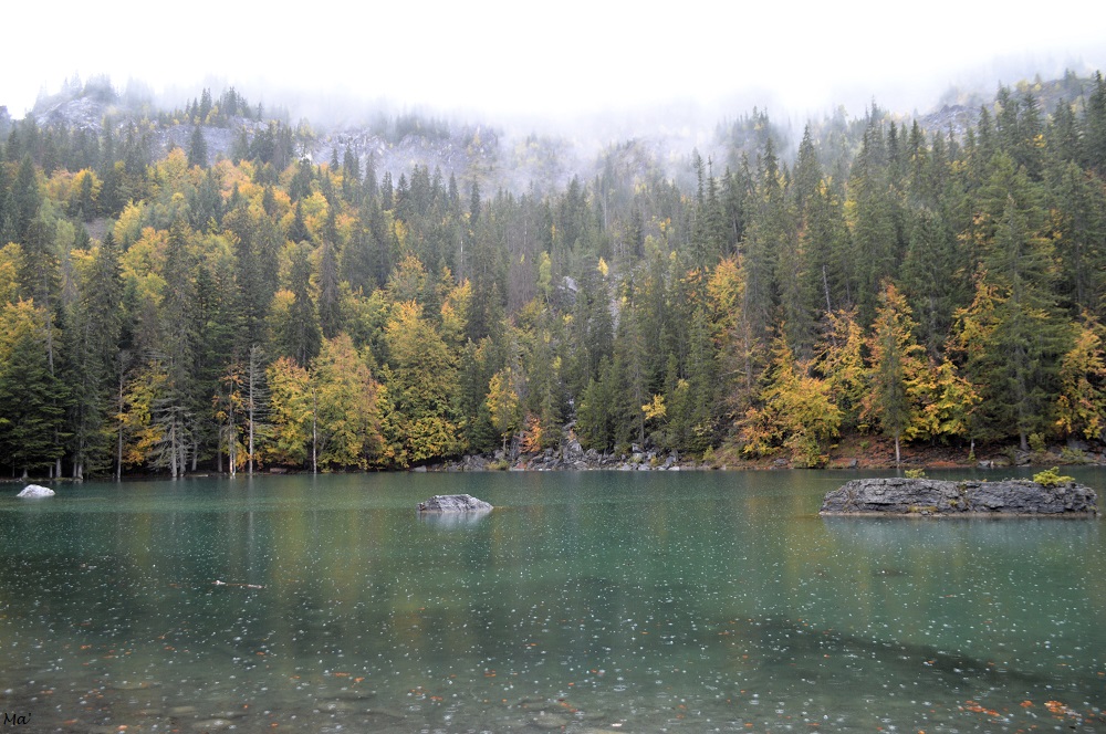 Après être redescendus de Notre Dame de la Gorge en passant par les Contamines et Saint Gervais, nous avons changé de côté de la vallée pour monter au dessus de Passy en direction du plateau d’Assy et du lac vert. Je dois bien avouer que la montée vers le lac m’a fait douter de notre capacité à profiter du lieu une fois arrivés. En effet, toute l’ascension s’est faite non seulement sous la pluie mais au cœur des nuages. Un fort brouillard nous empêchait de distinguer quoi que ce soit autour de nous. Mais, en arrivant sur le plateau d’Assy, et la station de Plaine-Joux, nous avons une bonne surprise : le ciel est (relativement) dégagé et nous ne sommes plus dans le brouillard. Nous descendons jusqu’au lac vert où nous bénéficions d’une ambiance absolument magique, entre les couleurs d’automne des hêtres et des mélèzes, la belle couleur du lac et les gouttes de pluie qui font des cercles à la surface de l’eau, tandis que les nuages s’accrochent sur les pentes.