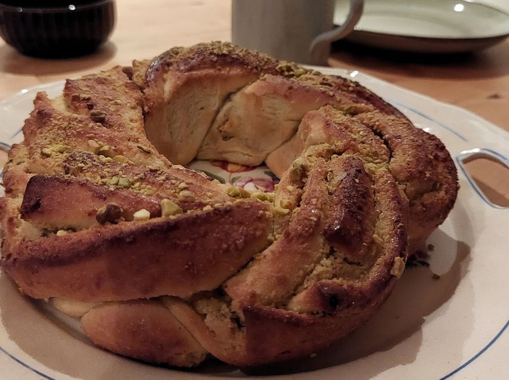 Depuis le début du mois, boulangeries et pâtisseries exposent fièrement les galettes feuilletées à la frangipane ou à la crème d’amandes dans leurs vitrines. Certains rivalisent d’originalité pour proposer des parfums moins classiques, parfois de façon éphémère. Je dois cependant avouer que je n’ai guère la frangipane ou la crème d’amandes. Je mange donc souvent de la galette des Rois plus pour partager un bon moment que par réelle gourmandise. Je cherche aussi des alternatives, et je regrette de ne pas trouver par chez moi de Royaume, ce gâteau des Rois du Sud aux fruits confits. Cependant, j’ai trouvé cette année une proposition à la fois gourmande et originale chez Picard : une babka des Rois au citron confit et à la pistache. Avec Melle 3e, nous nous sommes régalées lors d’un goûter royal il y a une quinzaine de jours.