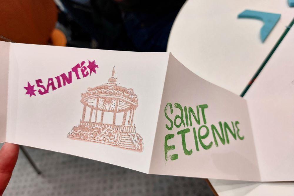 Les exemples du Dobry Lab sont nettement plus élaborés que nos créations. Ce qui est chouette, c’est que nous avons pu les utiliser pour personnaliser un petit leporello. Et comme nous étions ravis de cet atelier, nous nous sommes amusés à tamponner et signer les leporellos de tous les autres membres du groupe.Jouer avec les reflets !Une journée à Saint Etienne – exemple de leporello réalisé par le Dobry Lab à partir de tampons