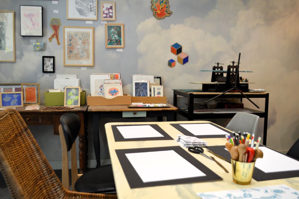 Après avoir admiré le savoir-faire industriel de Saint Etienne, il était temps pour nous de nous essayer à un atelier créatif. Nous étions attendus pour cela au Dobry Lab. Ce lieu hybride est à la fois un salon de thé et un atelier de créateur. L’équipe du Dobry Lab créé en effet des objets graphiques sur papier, bois et textiles qui sont proposés à la vente. Mais ils animent aussi des ateliers créatifs. Le thème du nôtre était la création de tampons. Après avoir vu les exemples proposés, j’avoue avoir un peu craint de ne pas être à la hauteur et de ne pas y arriver. Mais, guidée en pas à pas, et bien encouragée, j’ai réussi à me lancer et à produire un tampon plutôt sympa. L’atelier a été unanimement apprécié par notre groupe, malgré nos compétences en dessin disparates.