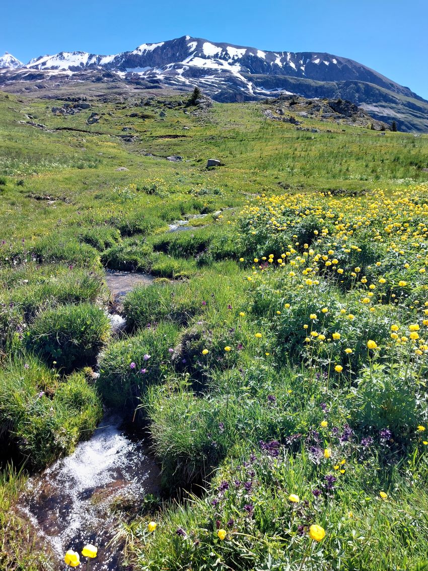 Sommet enneigé, ruisseau vif, trolles en fleurs, la beauté de l’alpage au printemps