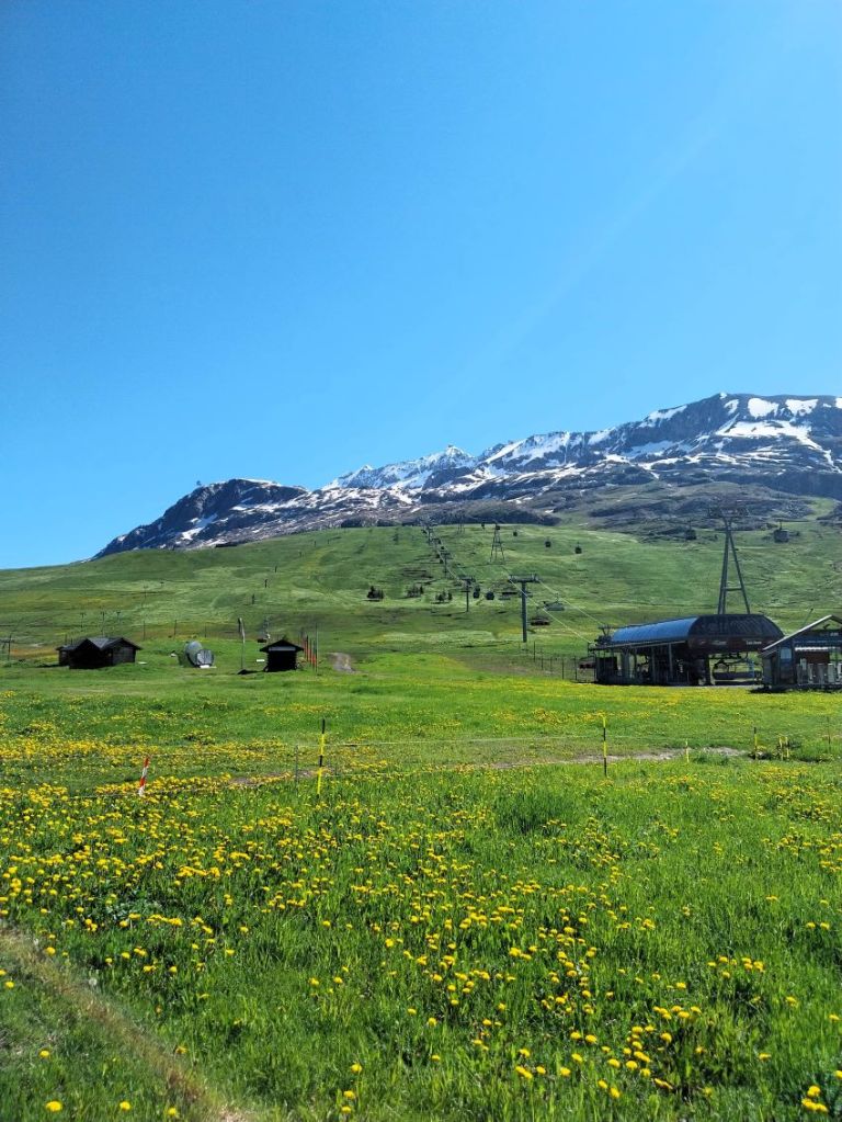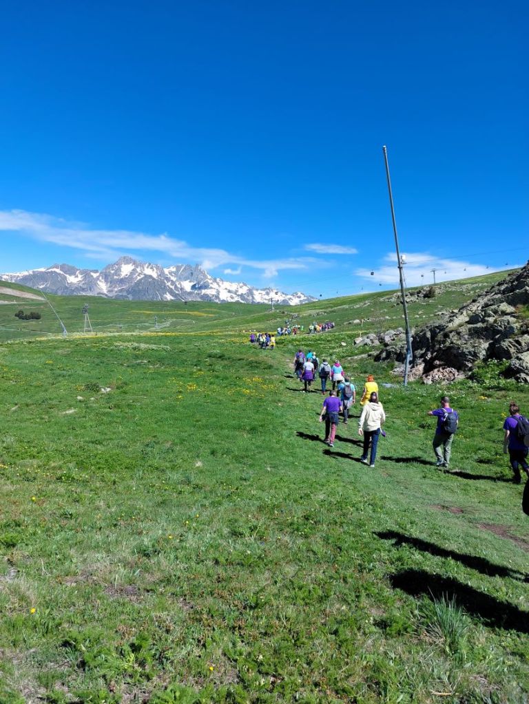 En arrivant, outre le panorama à 360° sur les massifs environnants (Belledonne, Taillefer et Ecrins en particulier), c’est le pique-nique qui nous attendait. Nous avions ainsi chacun un petit panier repas avec entrées, plats et desserts, ainsi qu’un joli choix de boissons bien fraîches, et un petit coussin pour nous asseoir. Nous nous sommes répartis sur tout autour de la station des remontées mécaniques. Nous avons profité du soleil (entre la randonnée sans ombre et le pique-nique, je n’ai pas manqué d’attraper un peu trop de couleurs). Nous avons profité du paysage en musique. Puis, petit à petit, nous avons pris le chemin de la descente, soit à pied (mon choix) soit via les remontées mécaniques. En effet, nos cars de retour respectifs nous attendaient à la station, et après ces deux journées très remplies, nous avions aussi hâte de pouvoir rentrer nous reposer un peu avant d’attaquer une nouvelle semaine de travail !