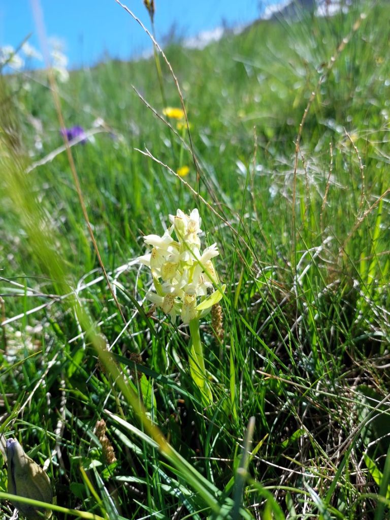 Très vite, le groupe s’est étalé selon les différentes allures. Des guides se sont positionnés à différents niveaux de notre colonne. Pour moi qui ai l’habitude de randonner seule, c’était très étrange de me retrouver avec autant de monde sur le sentier et de discuter tout en montant. Le chemin nous a emmenés à travers l’alpage couvert de fleurs. Les reines des prés parfumaient l’air. Les trolles coloraient de jaune des secteurs entiers. J’ai même repéré pas mal d’orchidées, en particulier des orchis sureau. Je n’avais pas pris mon appareil photo lors de ce week-end, mais je n’ai pas pu m’empêcher de prendre plein de photos avec mon téléphone (vous n’en voyez, je vous assure qu’une toute petite partie dans cet article !). Forcément, je me suis souvent arrêtée, me retrouvant chaque fois dans un nouveau petit groupe. Nous avons aussi traversé plusieurs fois des ruisseaux, parfois sur des petits ponts de planches, parfois simplement à gué.