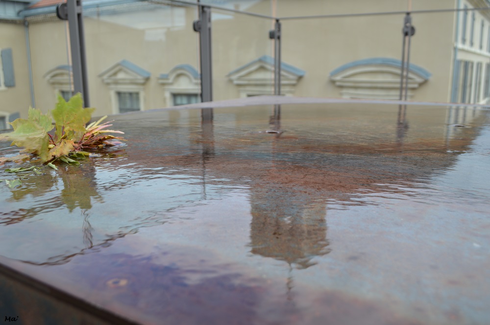 En passant sur la terrasse du musée, quelques feuilles mortes ont attiré mon regard sur un reflet froissé par le vent….