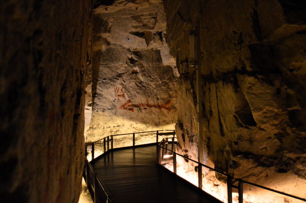 A vingt mètres sous terre – les inscriptions en noir sur les murs datent de la première guerre mondiale, celles en rouge de la seconde guerre mondiale où le réseau souterrain a été réemployé en particulier comme abriévocation de la messe de Pâques 1917, à la veille de l’assauttunnel creusé par les néo-zélandais lors des préparatifs de la bataille d’Arras