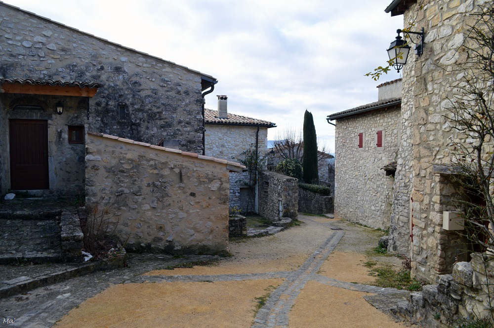 C’était un de ces dimanches matins de fin d’hiver, quand la météo hésite à basculer au printemps. Le ciel bleu m’avait poussée à aller me promener. Je n’avais pas encore décidé de ma destination quand j’ai pris la direction de la vallée de la Drôme. La dernière fois que j’étais allée à Mirmande, c’était aussi un dimanche matin mais en pleine canicule. Alors que le thermomètre flirtait à peine avec les 3°C, je me suis dit que ce serait l’occasion de revoir le village autrement.