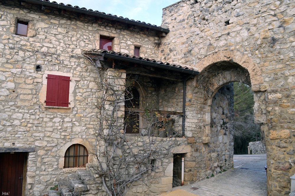Je retourne en direction du mur d’enceinte du village, et passe sous la porte de la Herse. Il s’agit là d’une des deux portes qui donnaient accès au village lorsqu’il était intégralement fortifié à partir du XIVe siècle (l’autre porte a aujourd’hui disparu). Elle donne au nord, sur l’ancien chemin des transhumances. De là, je descends la grande rue, m’arrêtant ici et là devant les façades des maisons restaurées. En effet, après la guerre, le vieux village était presque déserté, et il a fallu (comme dans nombre d’autres vieux villages) la volonté de quelques passionnés qui se sont lancés dans la reconstruction et la réhabilitation des lieux afin d’éviter la disparition du village.