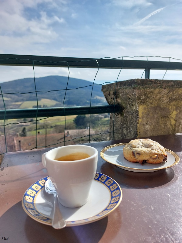 Comme il était effectivement l’heure du goûter, je n’ai pas manqué de suivre le conseil avisé de mon hôte du midi et j’ai donc fait une pause à l’auberge de Boffres. Installée au soleil sur la terrasse, j’ai profité de la vue et, cela avait un goût de vacances. L’auberge travaille beaucoup de produits locaux et le coup d’œil à la carte m’a donné envie d’y revenir pour un déjeuner (affaire à suivre donc..).