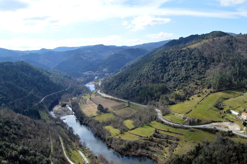 De la plateforme, le regard embrasse une partie de la vallée et la rivière déroule ses méandres à nos pieds. On est également suffisamment en hauteur pour voir les Monts d’Ardèche modeler le paysage. La vue est clairement époustouflante, et je me laisse hypnotiser par le ballet des ombres des nuages (il faut dire qu’il y a pas mal de vent le jour où j’y suis).