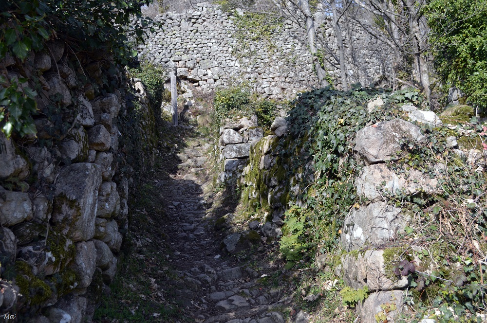 Afin de profiter au maximum du soleil, j’ai décidé de ne pas monter par la rue principale du vieux village mais de longer les anciens remparts en direction de l’est. Là, je prenais mon temps pour d’un côté admirer le paysage baigné de lumière et de l’autre, détailler les façades. Je remarquais par exemple de charmantes fenêtres fleuries ou de lourdes portes anciennes auxquelles je n’avais encore jamais prêté attention. Je m’en étonnais presque, tout en songeant que je n’étais finalement peut-être jamais passée encore par là.