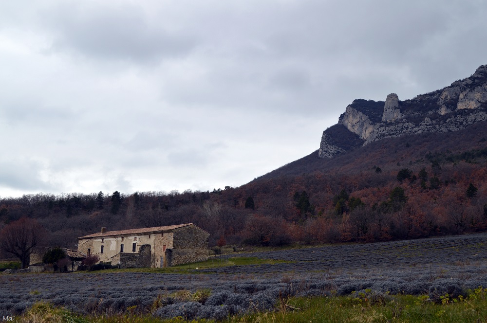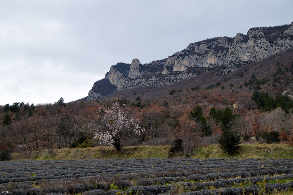 Après avoir regagné Saoû et avoir traversé le village, j’ai laissé ma voiture sur le parking situé sur la route de Crest. Juste derrière, j’ai avisé un champ de lavandes au pied des falaises de Roche Colombe et même si elles n’étaient pas encore en fleurs, je m’en suis approchée (note pour moi-même : revenir en juin quand tout sera fleuri). Là, un panneau indicateur a retenu mon attention. Il indiquait la direction de Roche Colombe, l’extrémité est du synclinal. Et, sans doute un peu fatiguée, j’ai cru lire 1.4 km (je précise tout de suite que ce n’est pas ce qui est réellement indiqué). Me faisant la réflexion que je ne pensais pas que c’était aussi près (parce que justement ce ne l’est pas…), j’ai commencé à m’engager dans cette direction.