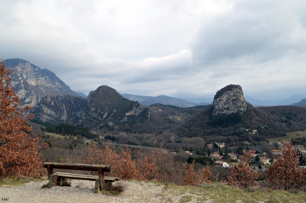 Le village de Saoû au pied des rochersPorte d’entrée vers la forêt de SaoûBanc avec vue