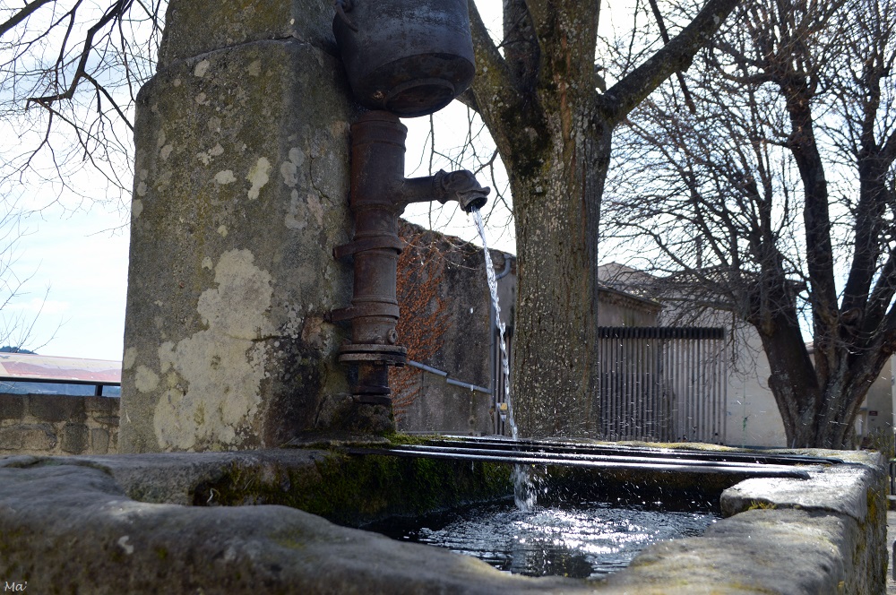 En descendant de voiture, alors que tout est encore très calme dans le village endormi, je n’ai pas pu manquer d’entendre le son de l’eau qui coule. En effet, juste derrière moi, il y avait une fontaine. En m’approchant, je remarque quelques violettes discrètes qui annoncent le printemps à venir. Je profite d’un long moment à me laisser bercer par le bruit de l’écoulement, hypnotisée. L’eau dans le bassin est cristalline et il doit être très agréable de s’y rafraichir lorsqu’il fait un peu chaud.