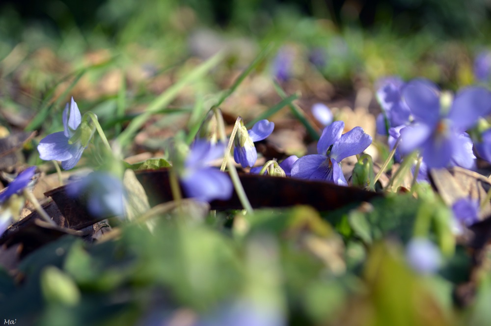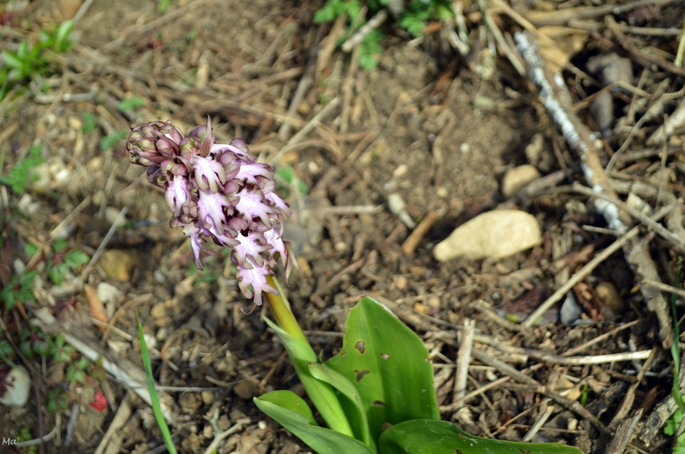 Tout autour de moi, le printemps commence à se faire sentir. Les oiseaux pépient dans les arbustes bordant le chemin et s’envolent en nuées à mon approche. Sur les talus, les fleurs commencent à montrer leurs couleurs. J’aperçois de très nombreuses violettes mais aussi quelques orchis géants (cette année encore, ma première orchidée aura donc été ardéchoise après celles vues à Saint Montan en février 2022).