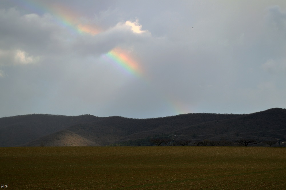 Finalement, je n’irai pas jusqu’aux tunnels. En effet, en me retournant, je vois la pluie arriver rapidement dans ma direction. N’étant pas du tout équipée pour l’affronter, je préfère faire sagement demi-tour. Outre le fait que je vais réussir à échapper aux gouttes qui n’arriveront sur moi qu’une fois à l’abri dans la voiture, je vais bénéficier d’un bel arc-en-ciel qui apparait et disparait au fur et à mesure de l’avancée de l’averse. Le spectacle est magique : l’arc-en-ciel semble par moments percer littéralement les nuages. En dépit de la promenade écourtée, je suis donc ravie du spectacle qui s’offre à moi !