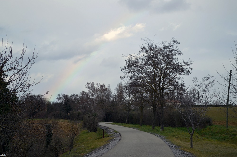 Encore assez discret, l’arc-en-ciel se profile au dessus de la voie douce de la PayreIl se met ensuite à complètement percer les nuages !